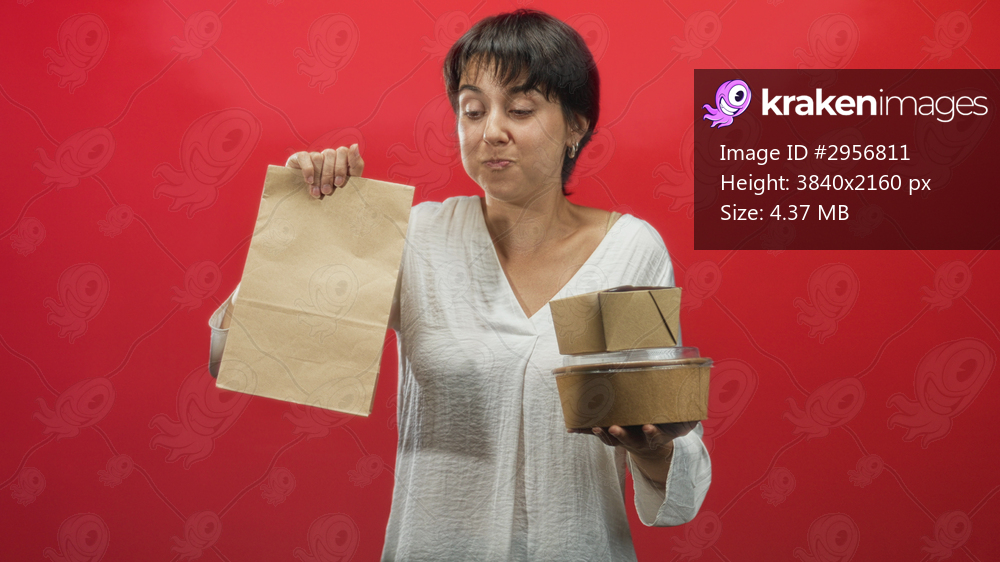 Woman holding paper bag and stacked takeout containers with hand, smiling in studio; sustainable convenience cheerful.