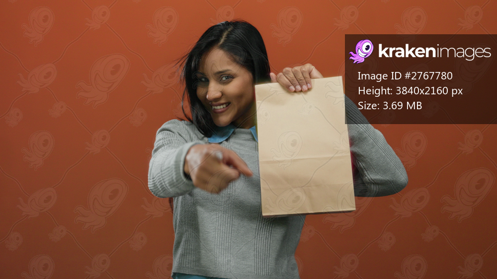 Woman holding paper bag while smiling against orange background pointing confidently with casual attire suggesting delivery or shopping theme.