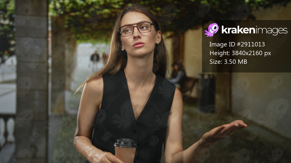 Woman holding paper coffee cup and gesturing with open hand while wearing glasses and a sleeveless black vest on street under stone arcade; calm contemplation. - Kraken Images