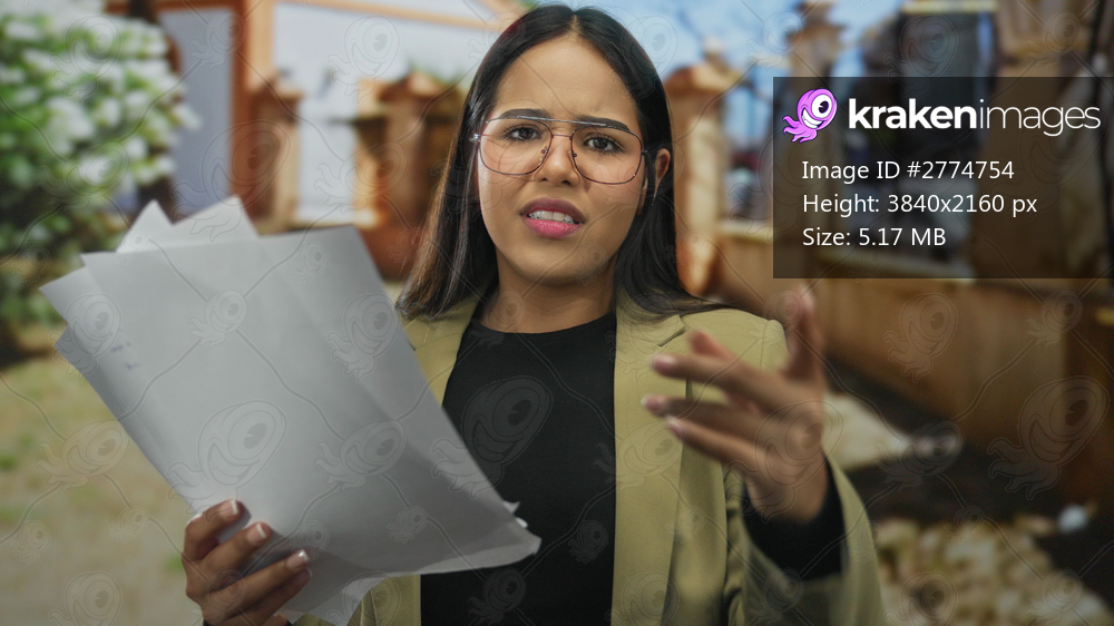Woman holding papers looks frustrated in park with young latin hispanic woman outdoors near green trees reading.