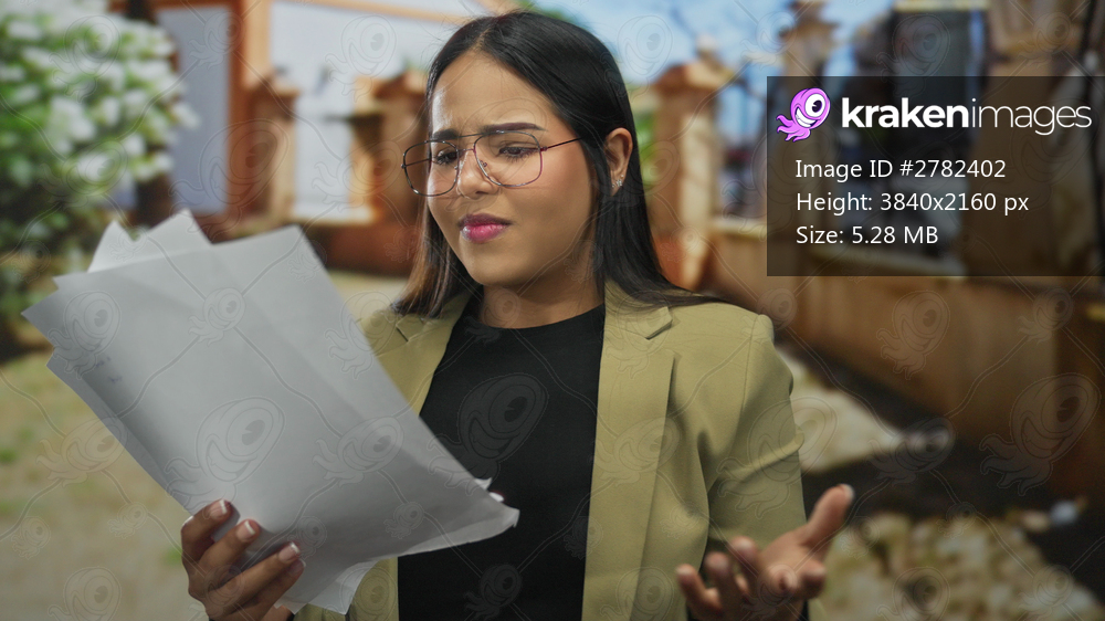 Woman holding papers looks frustrated in park with young latin hispanic woman outdoors near green trees reading.