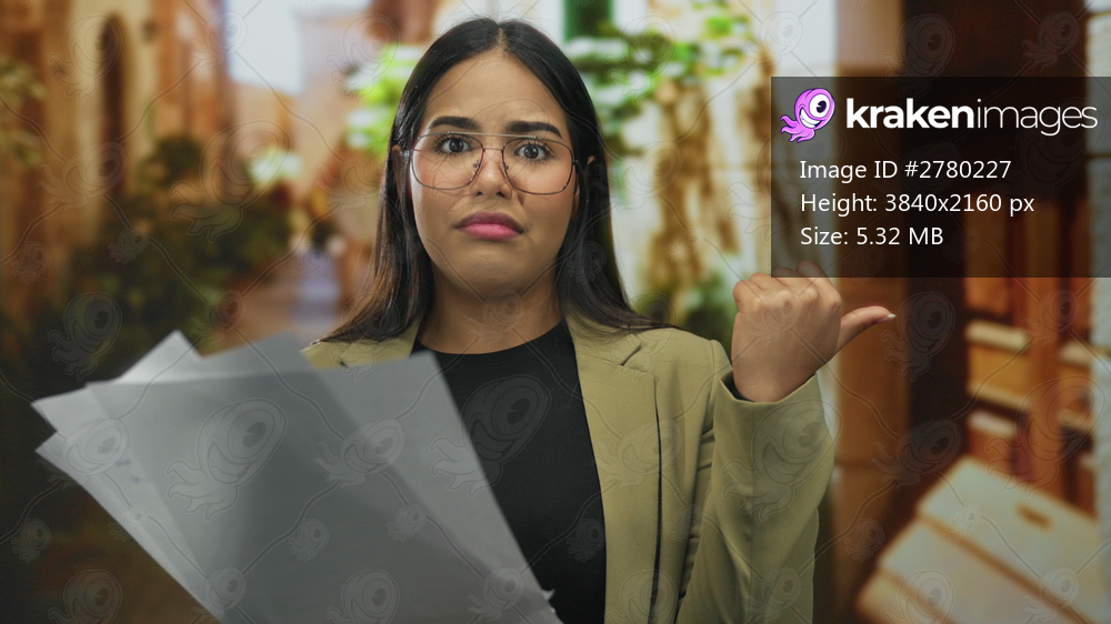 Woman holding papers on street expressing confusion with an urban backdrop highlighting her hispanic ethnicity in an outdoor setting wearing glasses and a blazer. - Kraken Images