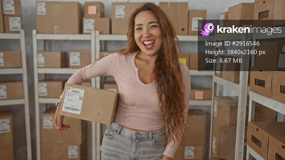 Woman holding parcel with exposed hand on box while smiling in storage building among shelves of packages; small business pride.