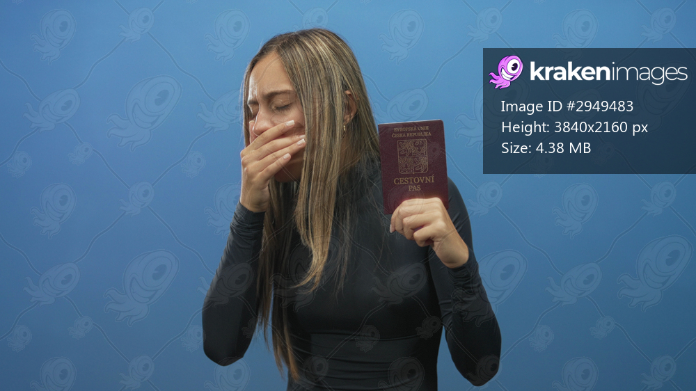 Woman holding passport, covering mouth and clutching chest in studio with blue backdrop; travel anxiety.