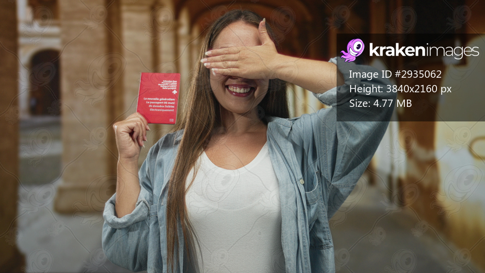 Woman holding passport with hand covering eyes on old town street, smiling broadly; travel joy adventure.