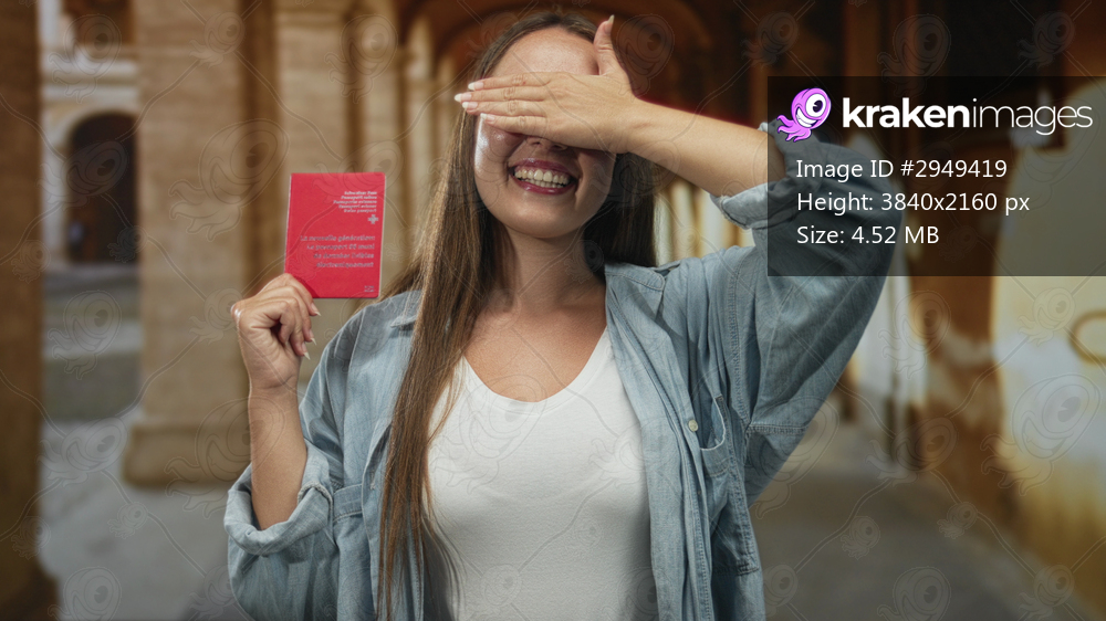 Woman holding passport with hand covering eyes on old town street, smiling broadly; travel joy adventure.