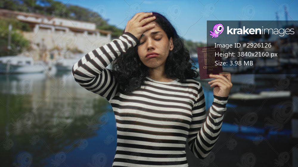 Woman holding passport with hand on forehead in building near marina boats and dock, looking weary; fatigue.
