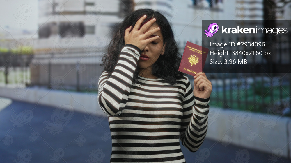 Woman holding passport with hand on forehead in front of building, striped shirt visible; travel frustration.