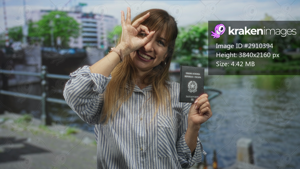 Woman holding passport in left hand and making ok sign with right hand on street in amsterdam near canal; travel adventure joy.