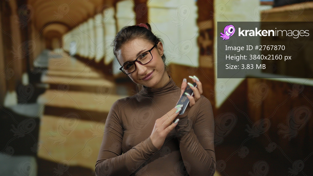 Woman holding passport indoors in old university setting surrounded by arches and warm lighting, showcasing thoughtful expression and casual attire with focus on identification. - Kraken Images