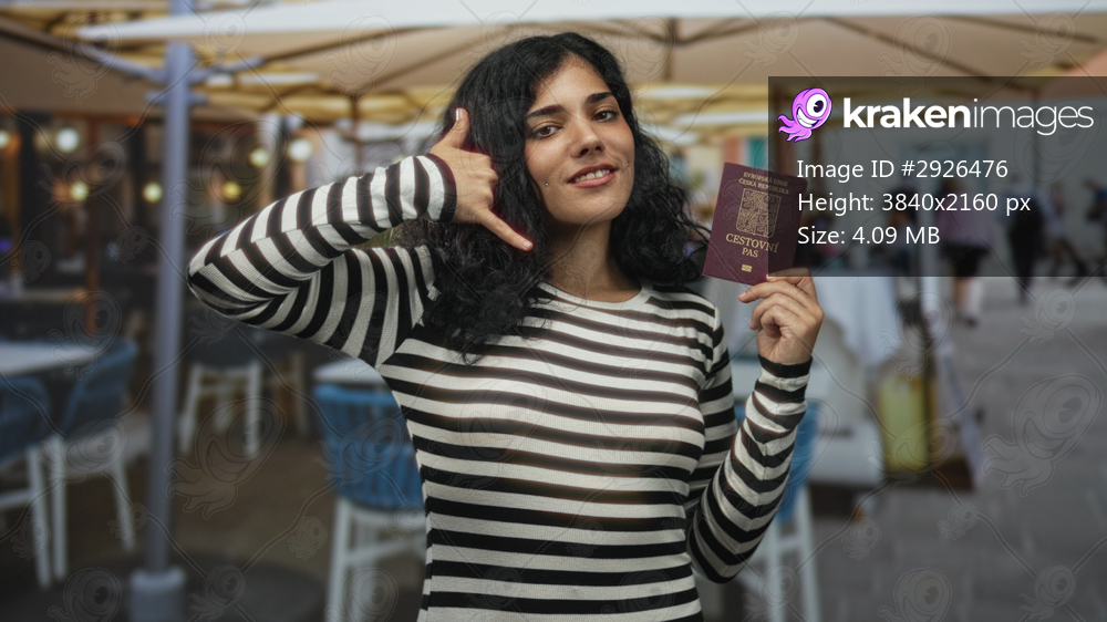 Woman holding passport and making call gesture on street terrace by outdoor cafe, looking at camera; travel confidence.