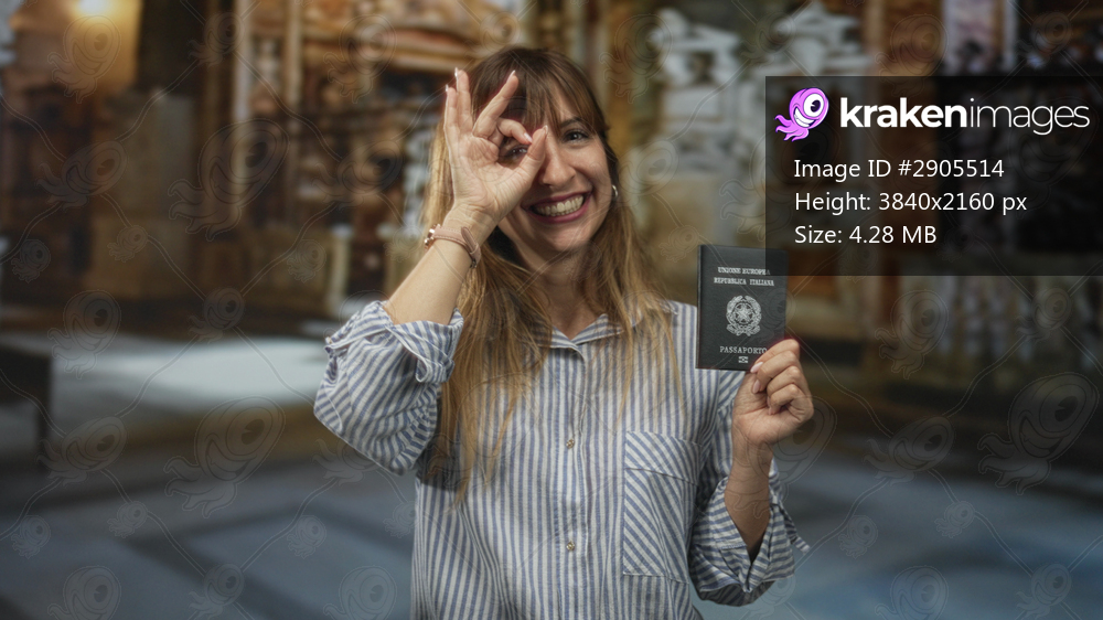 Woman holding passport and making ok sign in a church building, smiling and laughing; joy travel celebration.