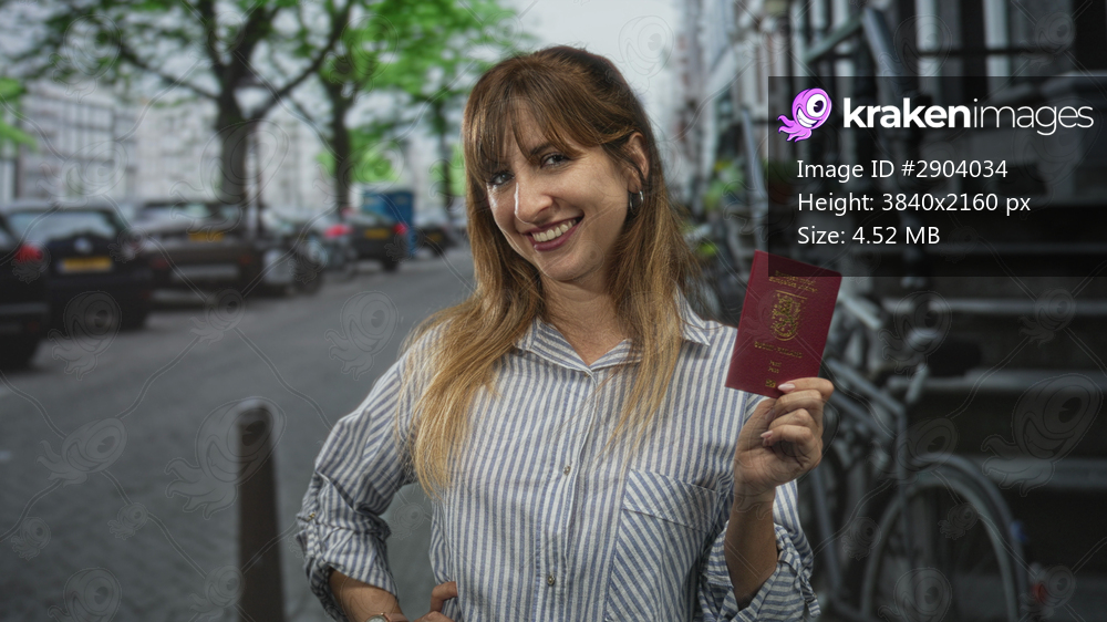 Woman holding passport on city street, hand on hip and smiling, striped shirt and bicycle rack at steps visible; travel confidence.