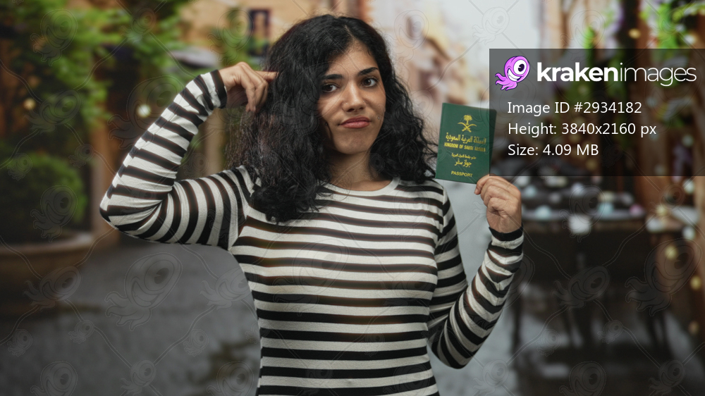 Woman holding passport and pointing finger to temple on street cafe terrace outdoors; frustration travel problem.