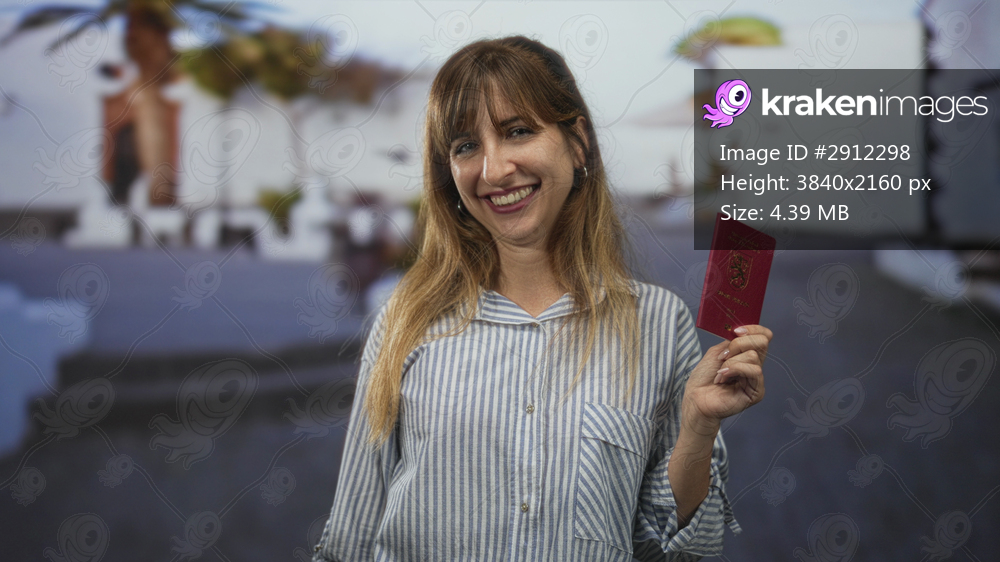 Woman holding passport and smiling with eyes closed on a sunlit street near whitewashed buildings and palm trees, hand raised showing document; travel joy. - Kraken Images