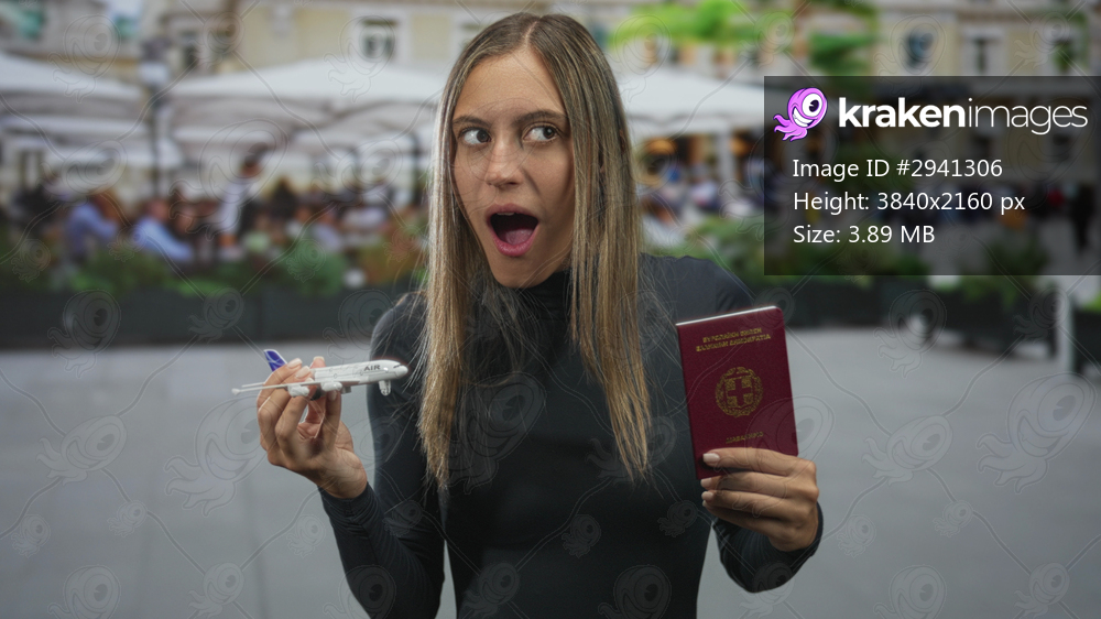Woman holding passport and toy airplane, mouth open in a crowded street cafe plaza; travel surprise.