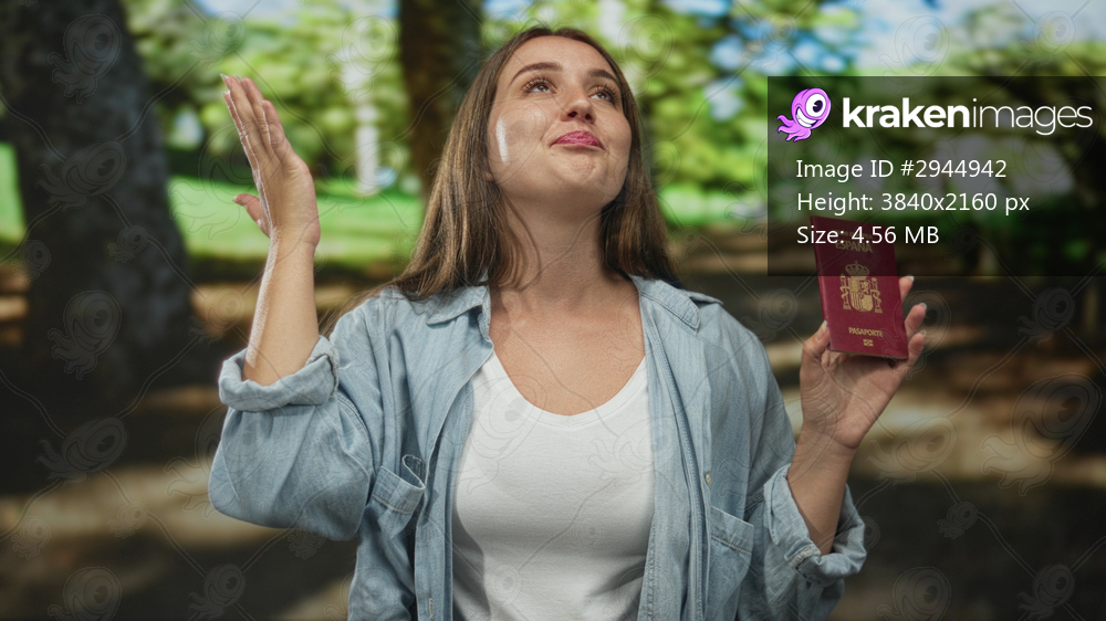 Woman holding passport up in forest setting, wearing denim shirt and white tank top and raising one hand in a gesture; pride travel.