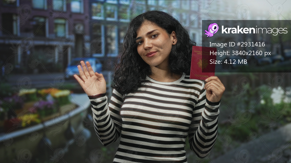 Woman holding passport and waving hand by canal boat and historic buildings on an amsterdam street, smiling gently; travel pride.