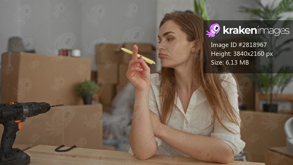 Woman holding pen with hand on chin in building surrounded by packed cardboard boxes and a power drill on wooden table; thinking.