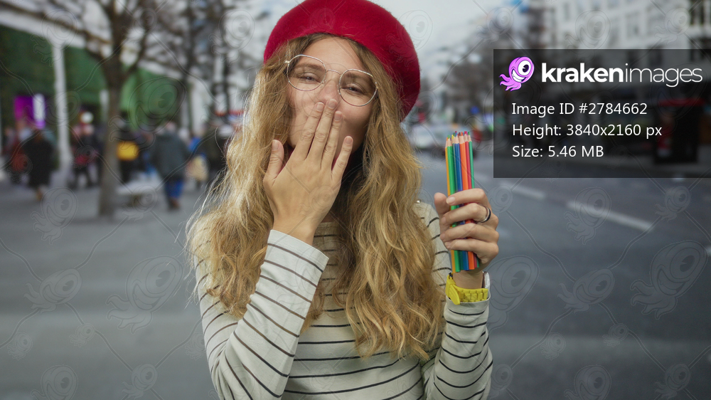 Woman holding pencils blowing a kiss in the middle of a street features a blonde young muse inspired by kiss graffiti across a city mural beside a colorful beret. - Kraken Images