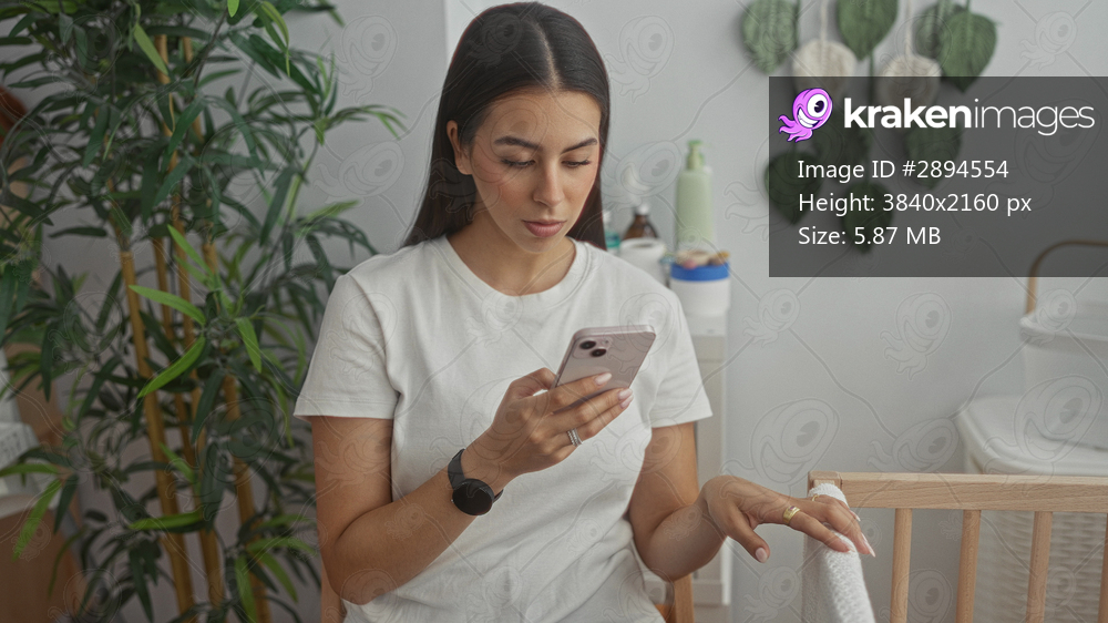 Woman holding phone by crib in bedroom, hands tapping screen while touching soft rail; maternal concern.