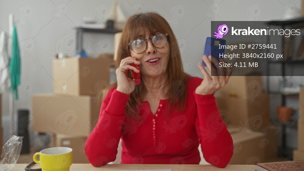 Woman holding phone and credit card smiling in new home living room surrounded by unpacked boxes and furniture highlighting transition and modern lifestyle convenience - Kraken Images