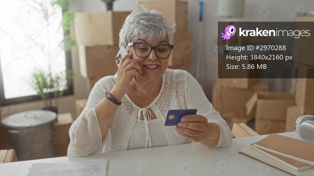 Woman holding phone to ear and creditcard in hand in building amid moving boxes and packed belongings; moving day calm.