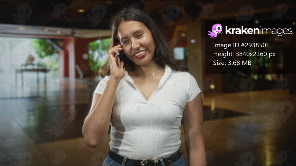 Woman holding phone to ear with hand near cheek, white top and jeans in hotel lobby; happy phone conversation.