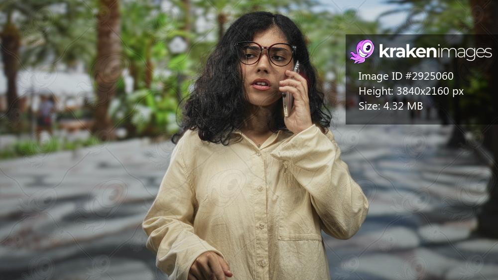 Woman holding phone to ear and pointing finger in street while wearing glasses and beige shirt; frustration urgency.