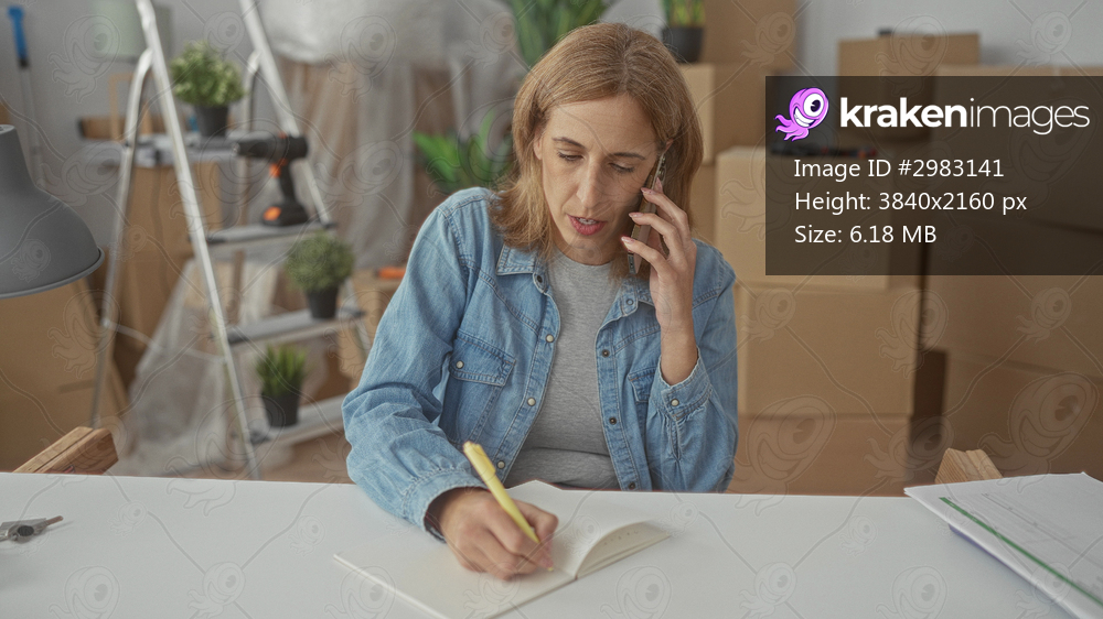 Woman holding phone to ear and writing in notebook at a table amid stacked moving boxes in building; stress planning.