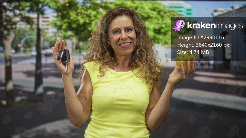 Woman holding piggy bank and car keys, wearing yellow top and smiling on a sunny street; financial independence confidence.