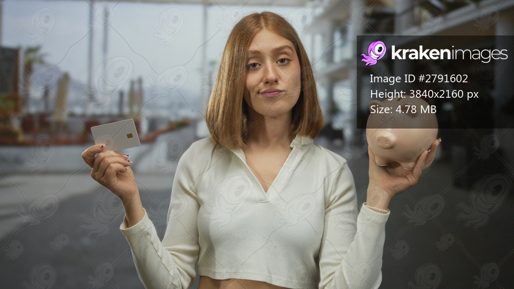 Woman holding piggy bank and credit card outdoors in urban setting contemplating savings or spending.