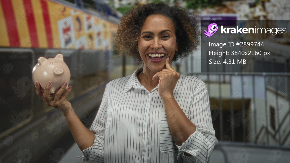 Woman holding piggy bank, finger to cheek, near train in station building, smiling; financial optimism.