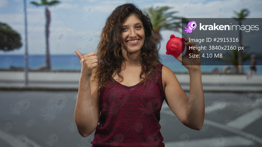 Woman holding piggy bank and giving thumbs up on street near palm trees and ocean; savings confidence success.