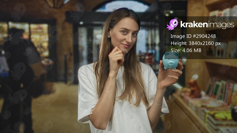 Woman holding piggy bank with hand on chin near bookshelves in a library building; saving planning thoughtful.