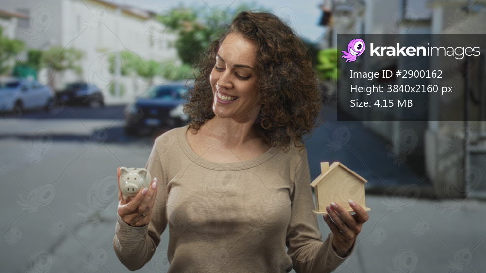 Woman holding piggy bank and wooden house with both hands on street; financial planning saving hopeful.