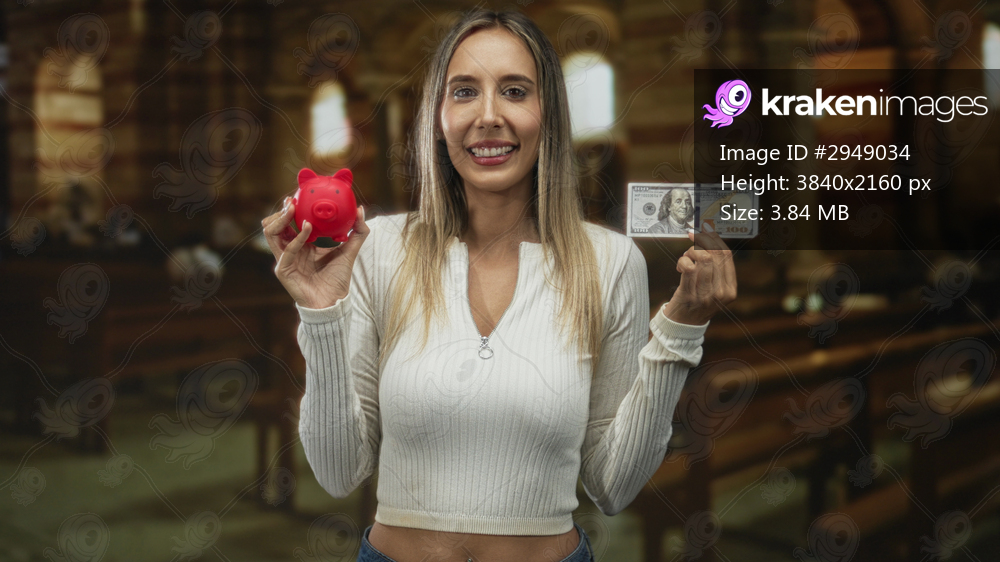 Woman holding piggybank and banknote in church building, smiling and presenting money; generosity faith reflection.