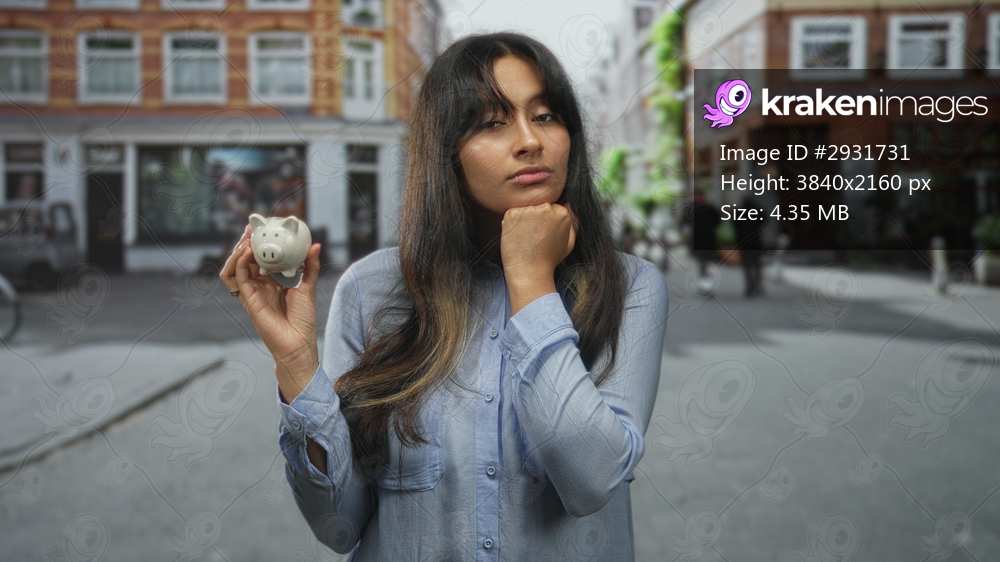 Woman holding piggybank in one hand and chin on fist on street with storefront building visible; money worry pensive.