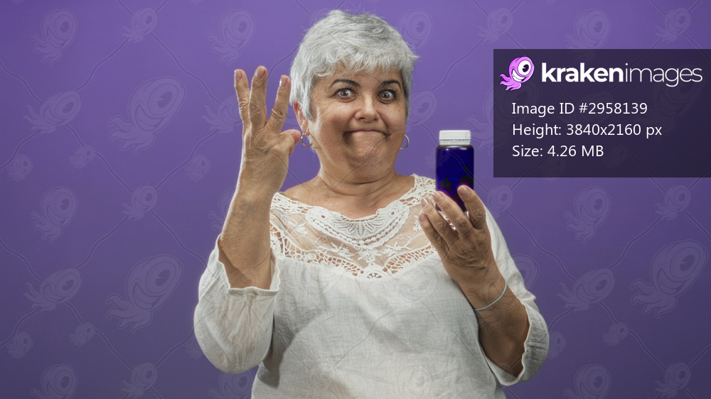 Woman holding pill bottle and counting on fingers in purple studio backdrop, expressive hand gesture and puzzled face; medication confusion.
