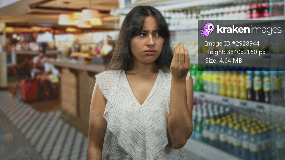 Woman holding pinched fingers hand gesture by beverage shelf in a building restaurant aisle; annoyance distrust hesitation.
