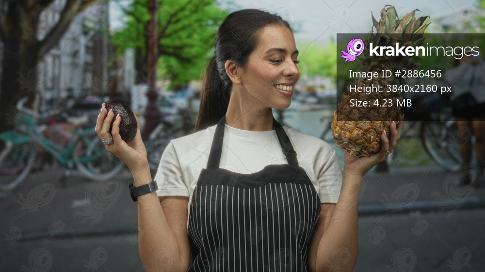 Woman holding pineapple and avocado on a street in amsterdam while smiling and presenting produce; healthy choice joy.