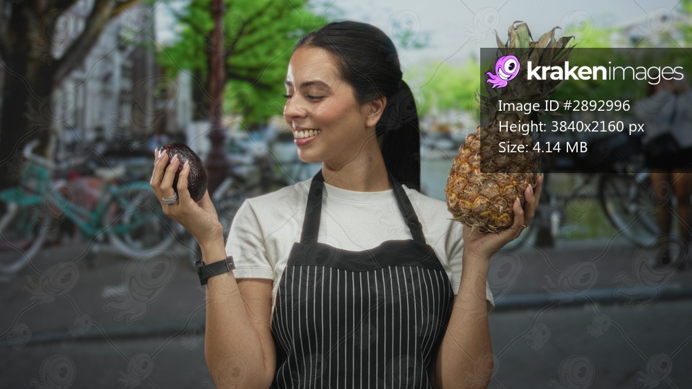 Woman holding pineapple and avocado on a street in amsterdam while smiling and presenting produce; healthy choice joy.