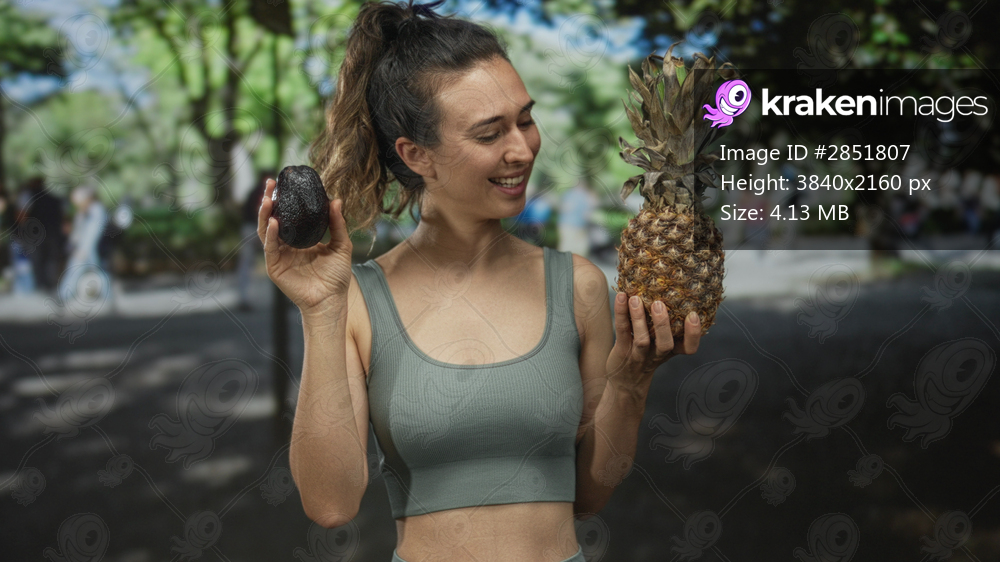 Woman holding pineapple and avocado while smiling under sunlight in lush green park outdoors; happiness.