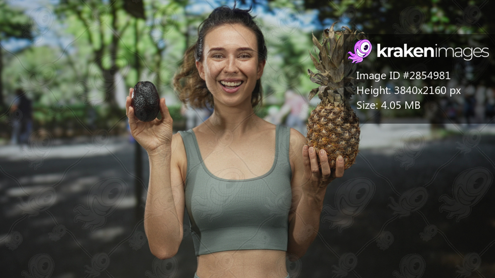 Woman holding pineapple and avocado while smiling under sunlight in lush green park outdoors; happiness.