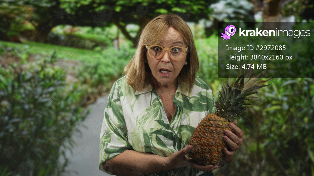 Woman holding pineapple with hands, pursed lips expression while standing on garden path amid lush hedges; surprise curiosity.