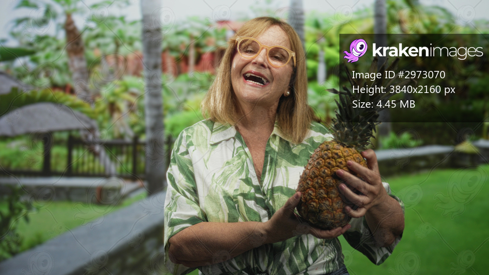 Woman holding pineapple with hands, smiling and looking at camera in forest setting, wearing leaf print shirt and glasses; tropical joy.