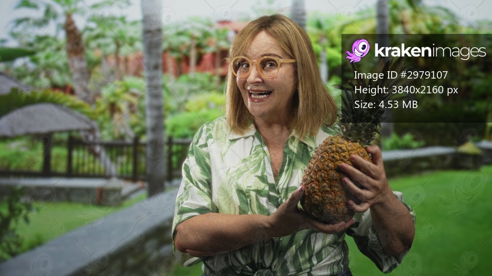Woman holding pineapple with hands, smiling and looking at camera in forest setting, wearing leaf print shirt and glasses; tropical joy.