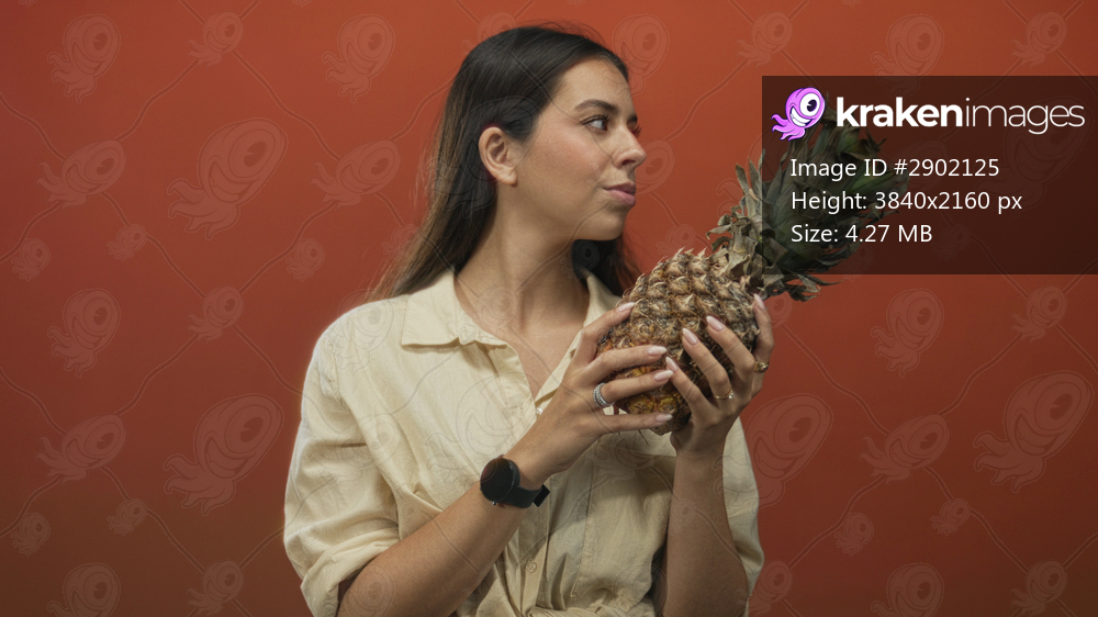 Woman holding pineapple and looking to the side in an orange studio, wearing cream shirt and rings on fingers; serenity.