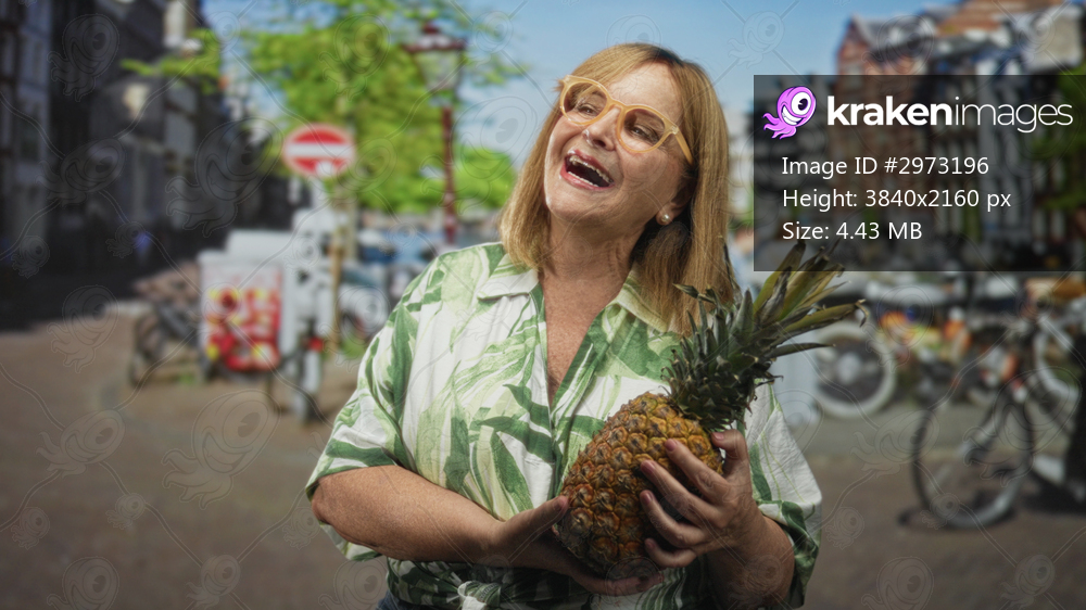 Woman holding pineapple on a sunlit city street with bicycles and canal houses, wearing green leaf shirt and glasses; joyful travel.