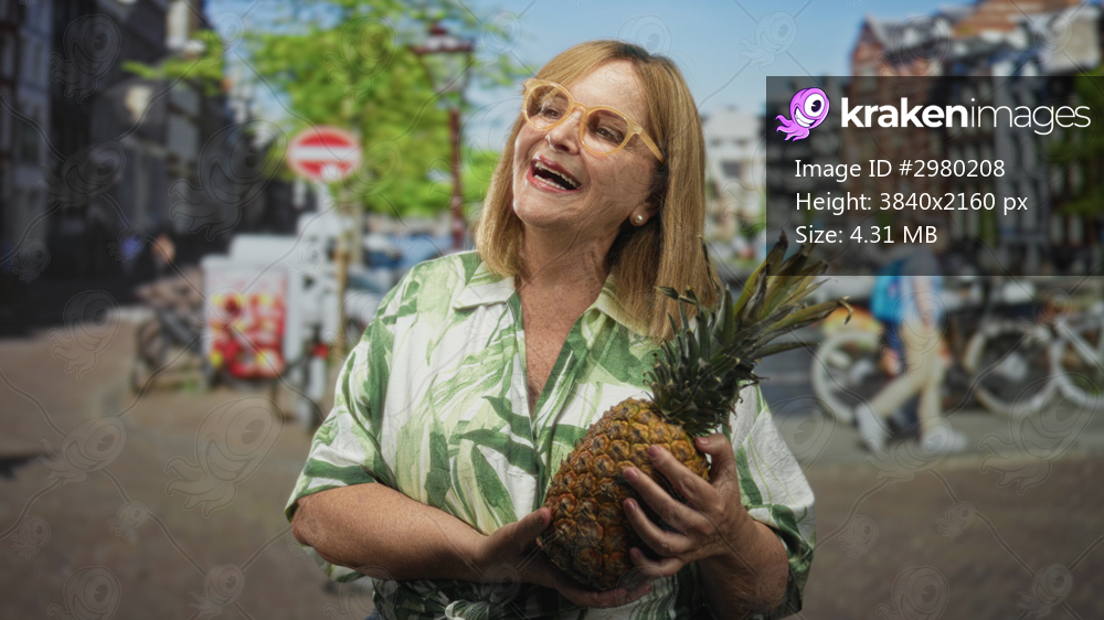 Woman holding pineapple on a sunlit city street with bicycles and canal houses, wearing green leaf shirt and glasses; joyful travel.